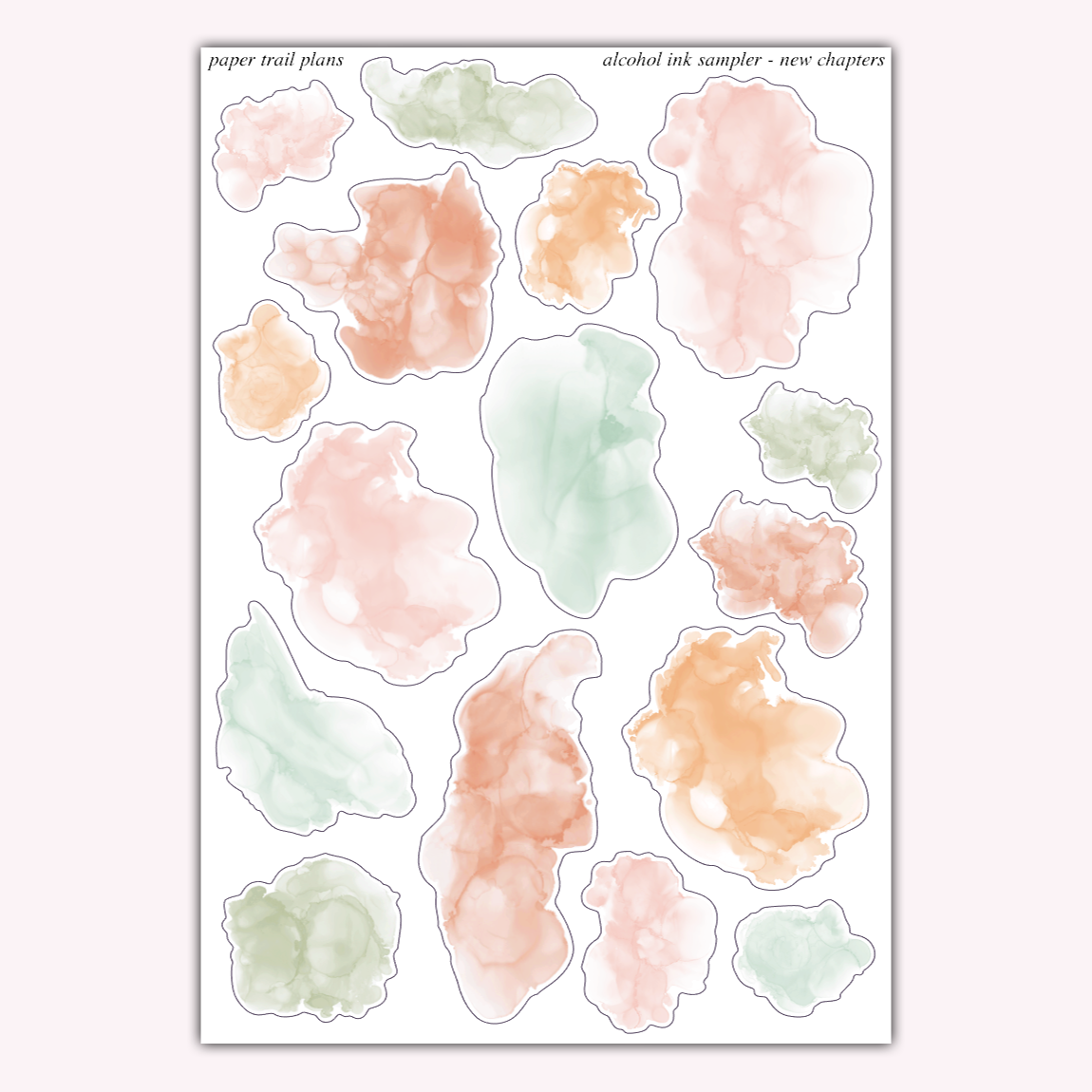 This sheet measures approximately 5x7", and contains a variety of alcohol ink swatches in varying sizes, printed on transparent matte or washi paper.