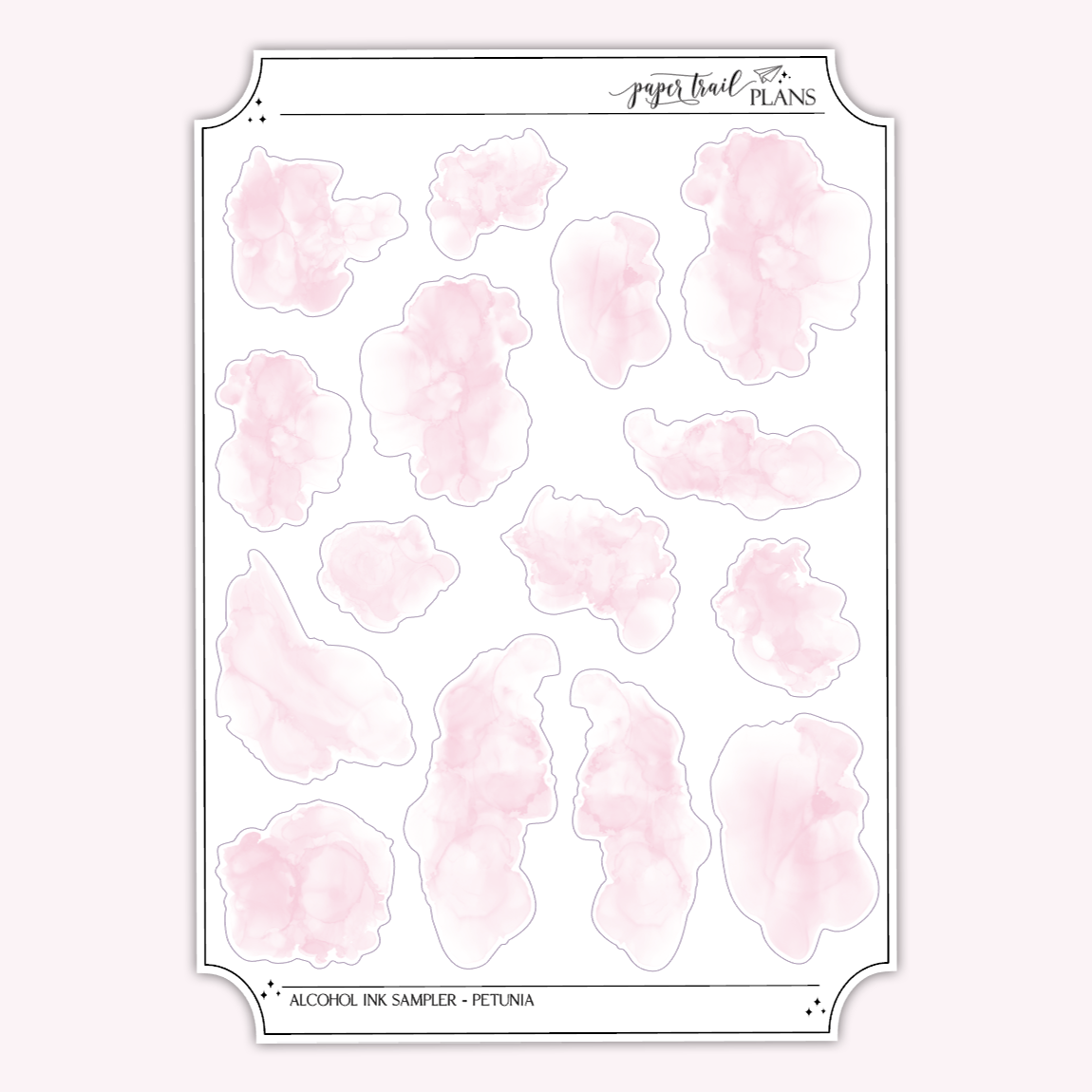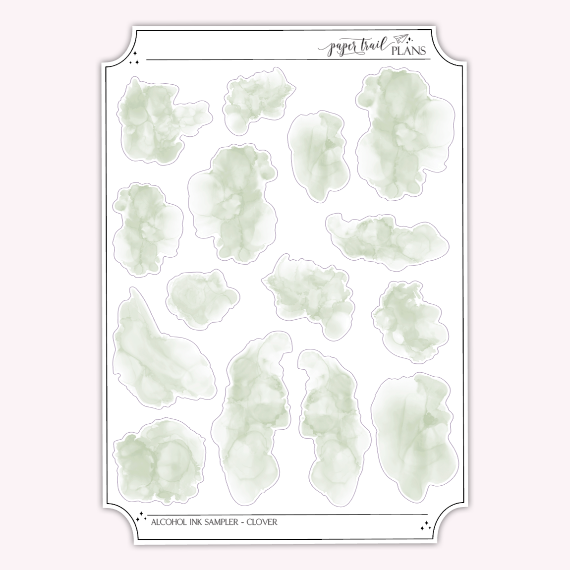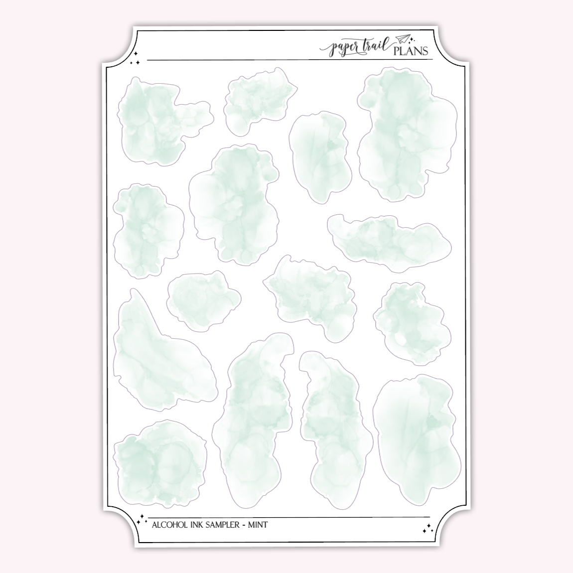 Each sheet contains alcohol ink swatches in varying sizes, printed on transparent matte and washi paper.