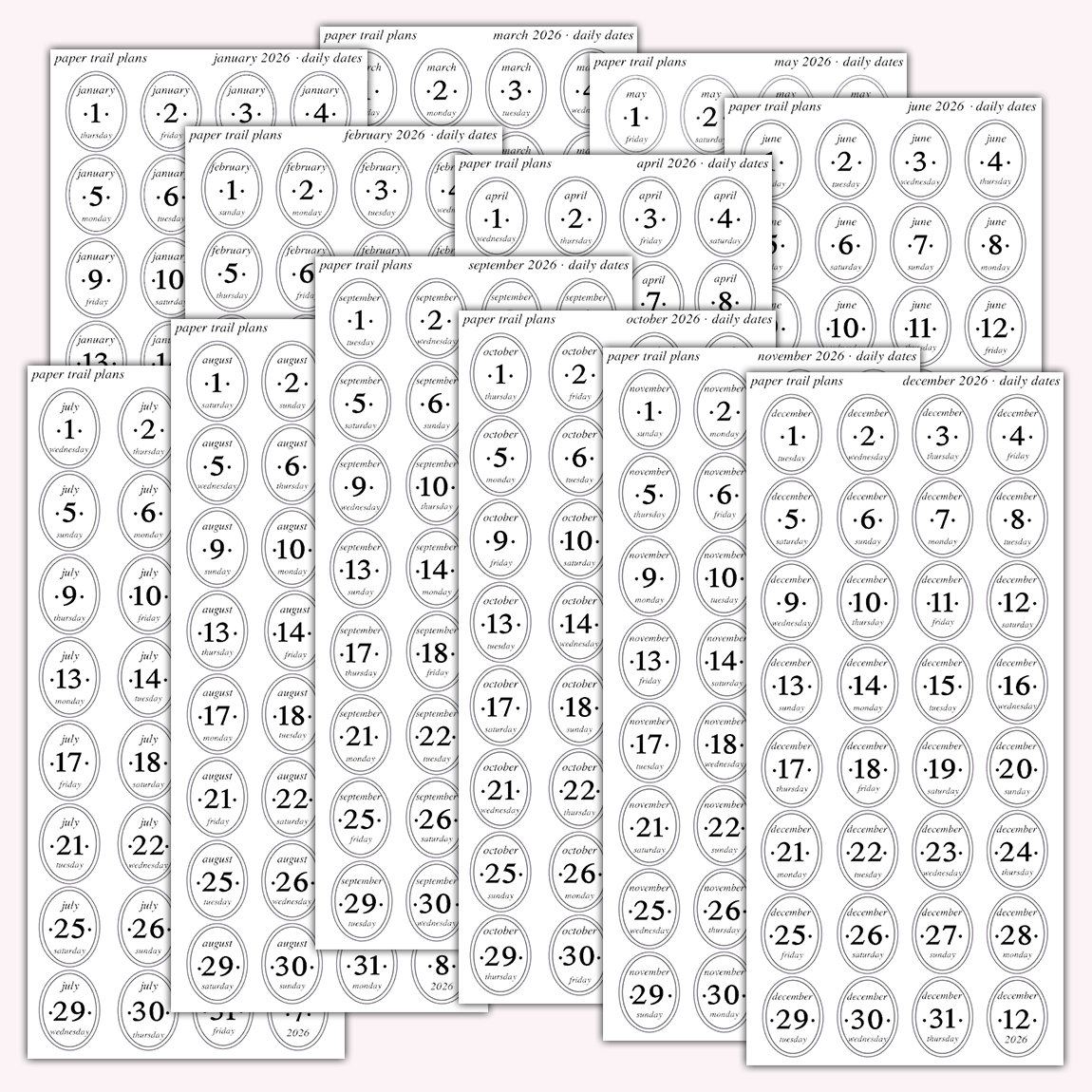 Introducing our foiled daily date samplers! Each month's worth of dates is available à la carte by month, or in a 12-month bundle by foil color. 12-month bundles are discounted!