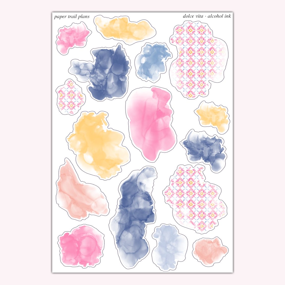This sheet measures approximately 5x7", and contains a variety of alcohol ink swatches in varying sizes, printed on transparent matte or washi paper.