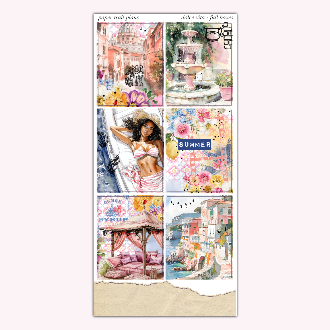 This sheet measures 3x7", and contains 6 full boxes sized 1.5x1.9". These designs coordinate with the Dolce Vita collection, which can be found here.
