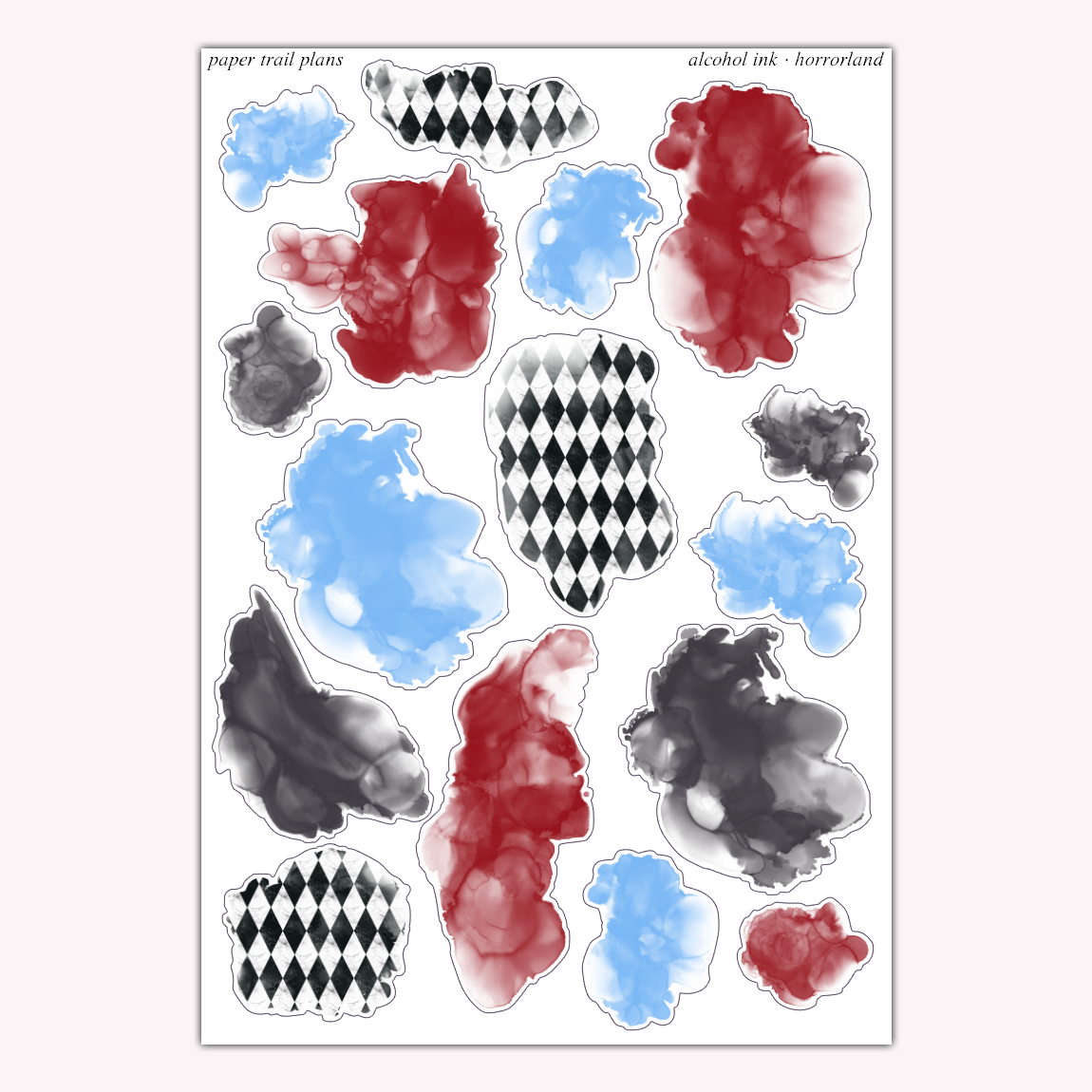 Our capsule collections were also designed to coordinate well with our functional sheets, like lace doilies, alcohol ink, & washi strips. “Horrorland” perfectly pairs with the colorway "Ocean Breeze" in our summer color palette, & the colorway "Apple Pie" in our autumn color palette.